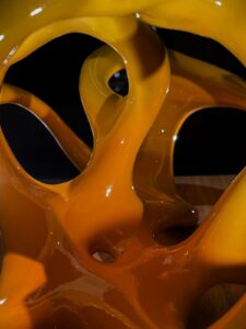 Nick Ervinck’s work is distinguished by a strongly contemporary visual language in which sculpture, digital modeling, and 3D printing technologies merge to generate unprecedented forms. His works, often characterized by glossy surfaces and intense colors, evoke organic structures that seem to belong to a world suspended between biology, architecture, and futuristic imagination.